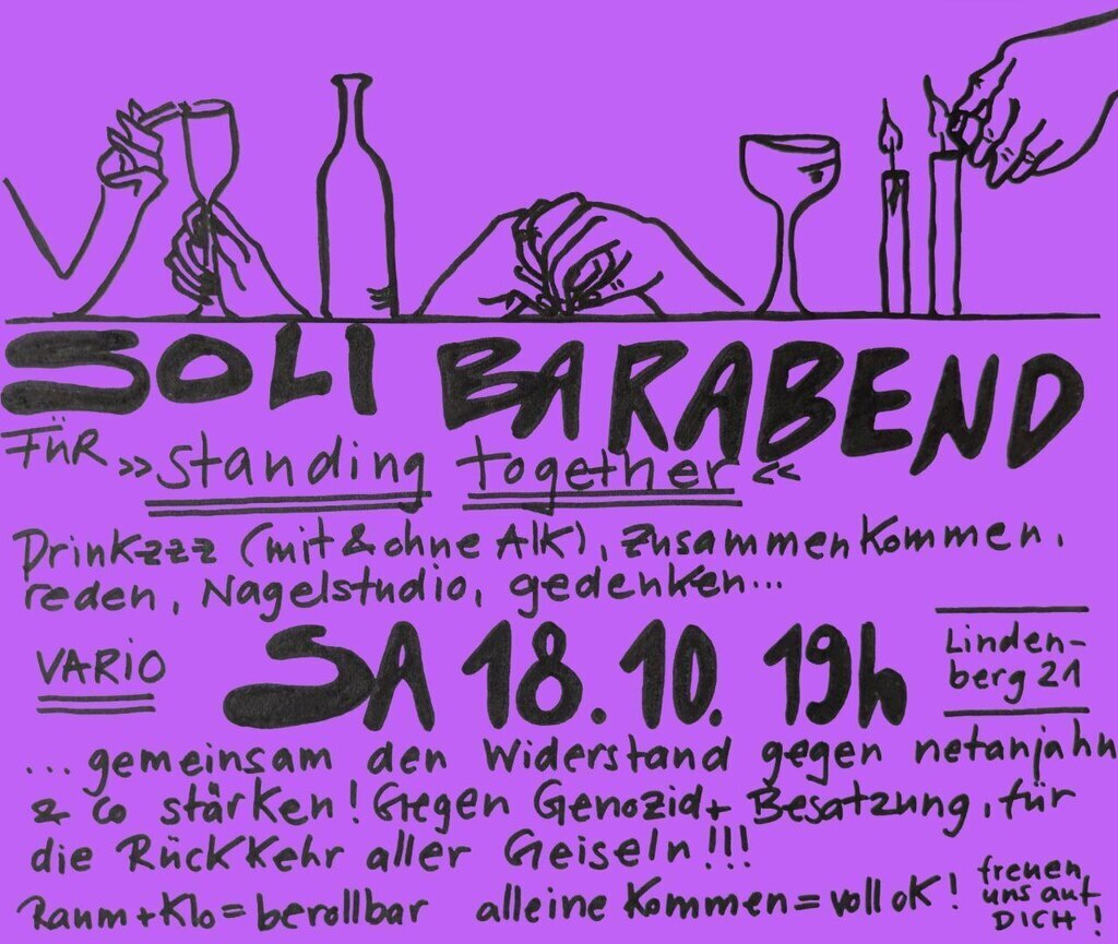 Drinkzzz (mit und ohne Alk), Zusammenkommen, reden, Nagelstudio, gedenken, gemeinsam den Widerstand gegen Netanjahu & Co stärken! Gegen Genozid + Besatzung, für die Rückkehr aller Geiseln!
