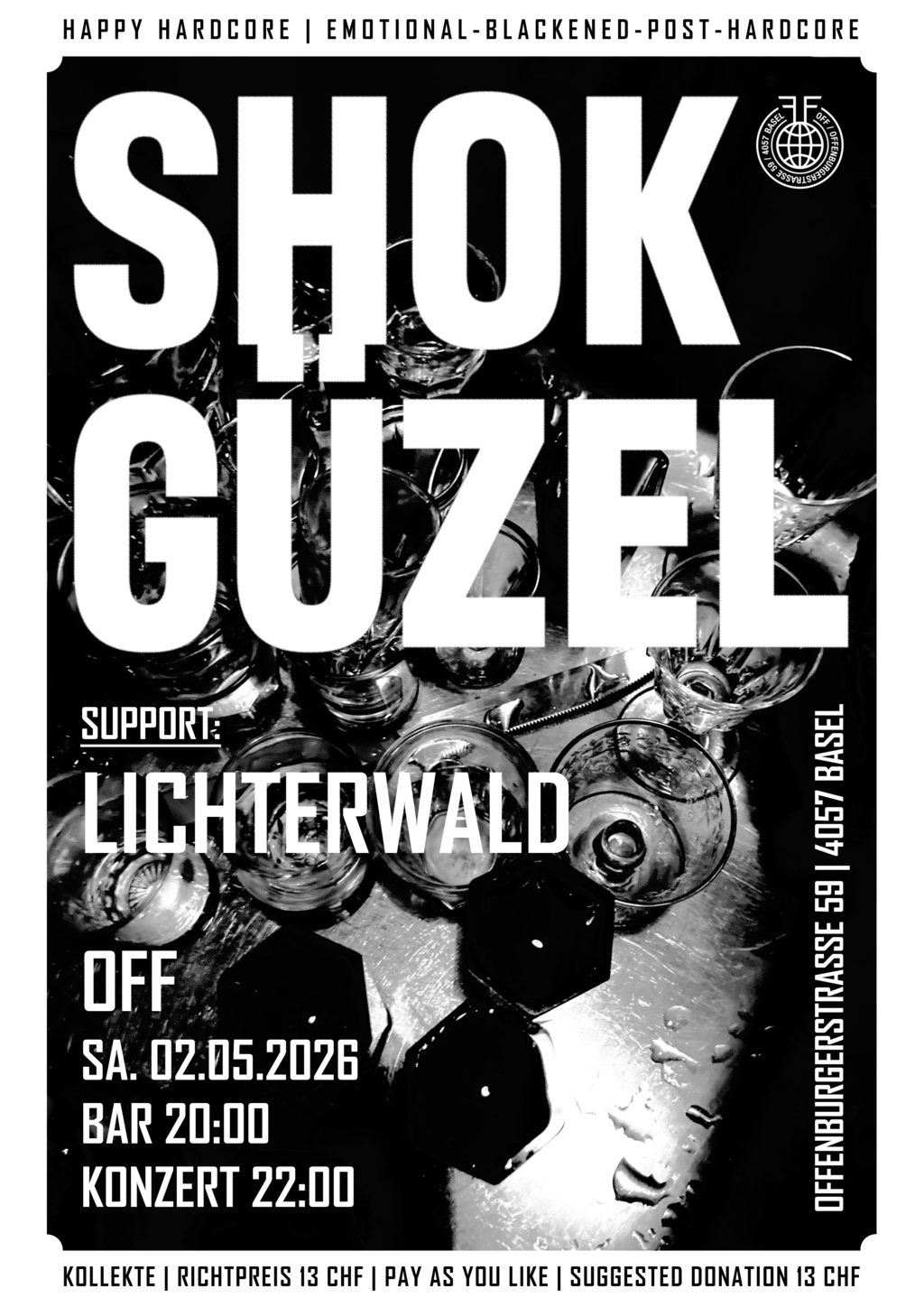 SHOK GÜZEL (Rhein-Main/Berlin,DE) vereint 4 Menschen mit verschiedenen musikalischen Hintergründen und spannt einen Bogen zwischen Hardcore, Punk und anderen Genre. Trotz der Selbsteinordnung als 'Happy Hardcore', vereinen die englischen und türkischen Texte eine klare antifaschistische und feministische Haltung, welche manchmal nicht happy ist.