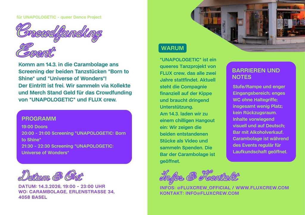 "Unapolgetic" ist ein queeres Tanzprojekt, welches alle zwei Jahre stattfindet und von FLUX crew organisiert wird. Leider ist FLUX crew und somit UNAPOLCETIC finanziell auf der Kippe und braucht unbedingt Unterstützung. Darum findet am 14.3. dieser Event statt, bei dem wir bei einem chilligen Hang out, die beiden schon entstandenen Tanzstücke via Video schauen und Geld sammeln. Die Bar der Carambolage währenddessen offen.