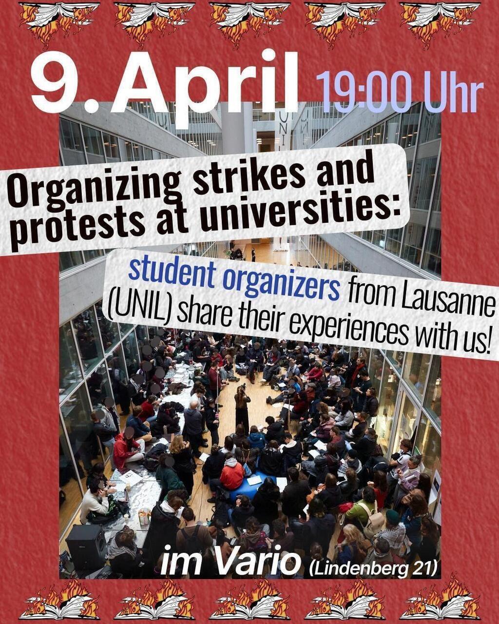 Am 9. April kommen studentische Organisator*innen aus Lausanne (UNIL) nach Basel, um ihre Erfahrungen mit uns zu teilen. Im vergangenen Herbst und Winter haben sie im Rahmen der kantonalen Streikbewegung im Waadtland gegen Kürzungen im öffentlichen Dienst an der Universität Lausanne an der Organisation grosser Proteste, Besetzungen und Streiks mitgewirkt. Die Studierenden werden uns einen Einblick geben, und anschliessend werden wir gemeinsam diskutieren, wie wir starke studentische Bewegungen gegen die nationalen Sparpläne aufbauen können.🔥