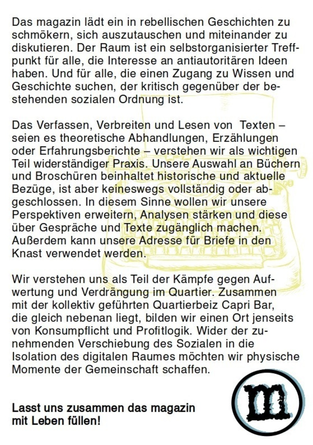 Das Magazin - die anarchistische Bibliothek Basel - ist heute geöffnet.