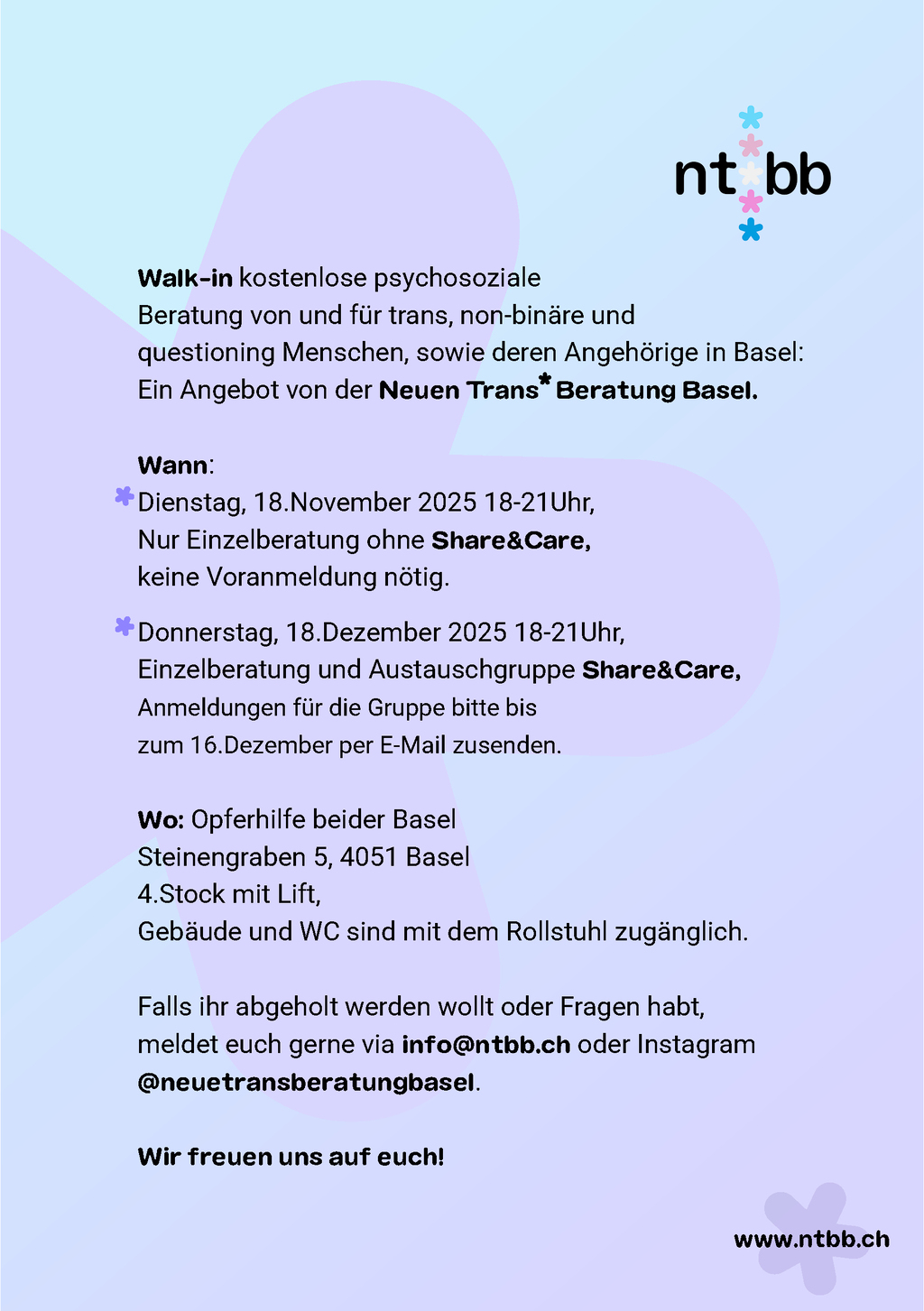 ⚧️Walk-in kostenlose, psychosoziale Beratung von und für trans, non-binäre und questioning Menschen, sowie deren Angehörige in Basel.