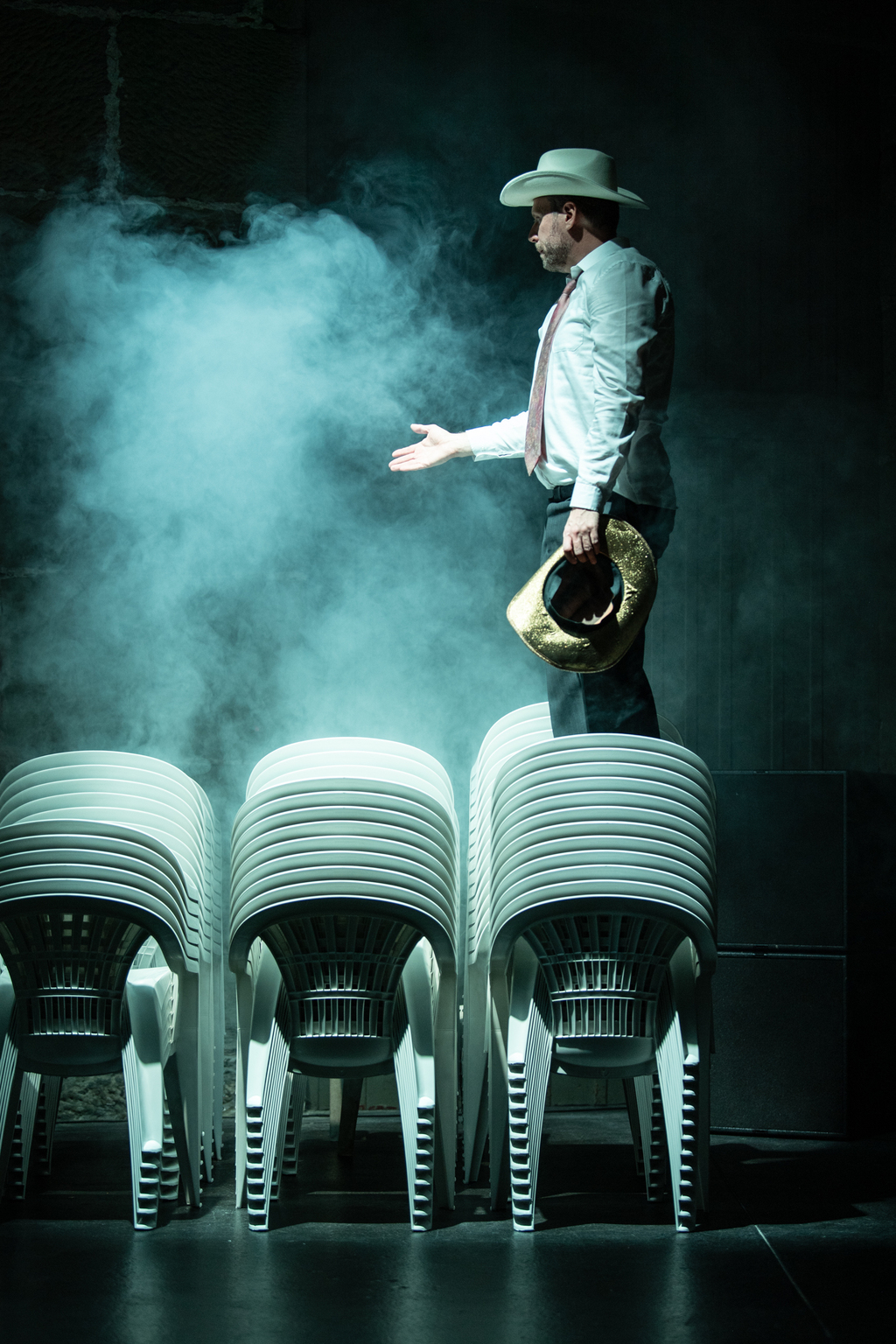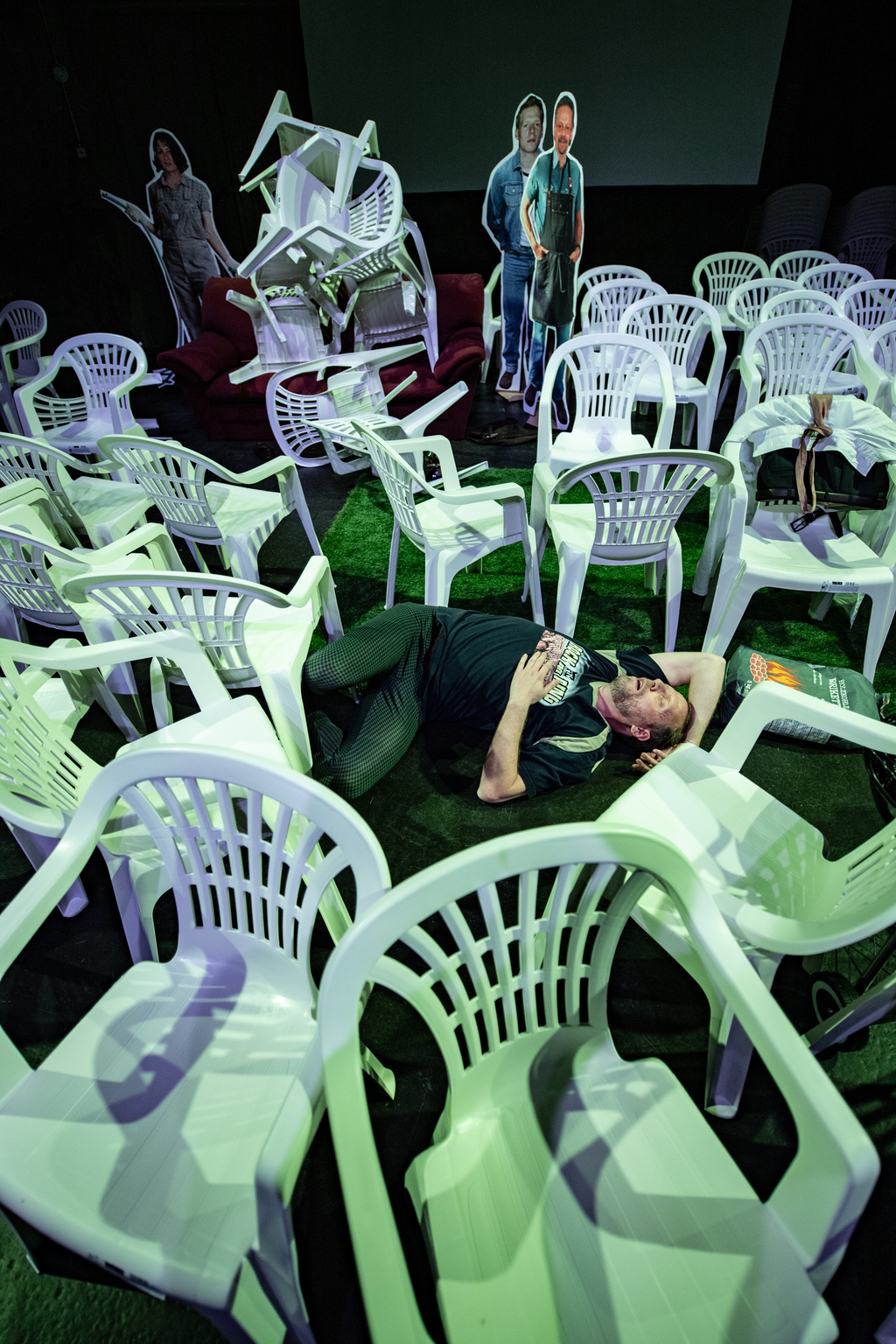 Der Gartenstuhl Piccolo II, Fernsehrichterin Barbara Salesch, die radikal-kapitalistische Autorin Ayn Rand und J.R. Ewing aus der US-Serie «Dallas» – sie alle werden in «Mülheim Absturz Ruhr» zu Kronzeug*innen zweier Abstürze, die gegensätzlicher nicht sein könnten.